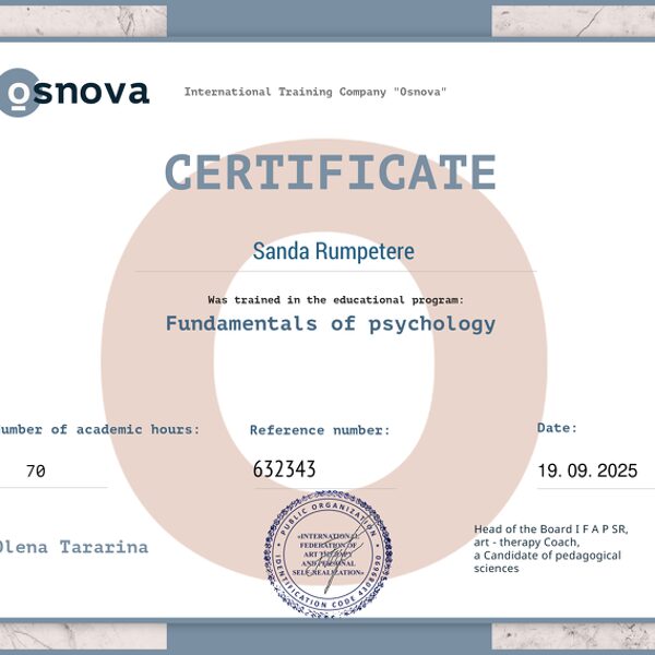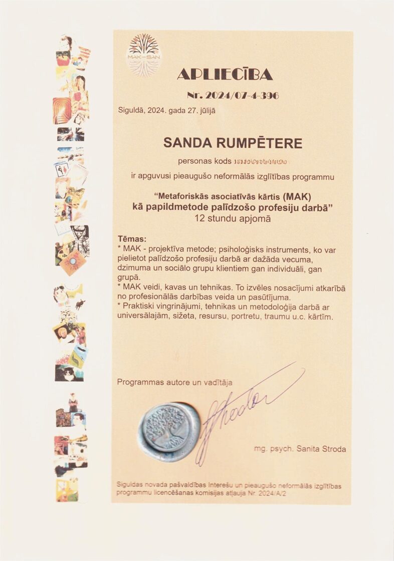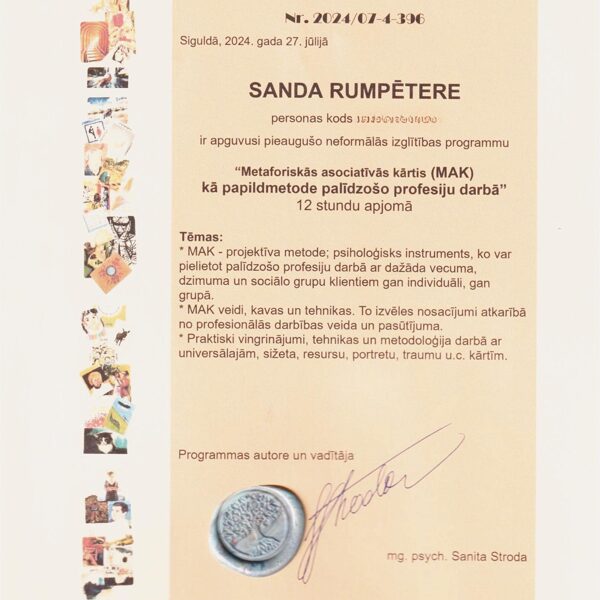 Man svarīgs ir ne tikai intuitīvs aspekts darbā, bet arī mūsdienu psiholoģija, kas palīdz izprast mūsu uzvedības un domāšanas modeļus ikdienā.Esmu pastāvīgā mācību un izzināšanas procesā, jo ticu, ka personīgā izaugsme nav galapunkts, bet ceļojums, kurā katrs solis atklāj jaunas iespējas. Katra jauna apgūtā metode sniedz lielāku spektru darbā ar klientiem.